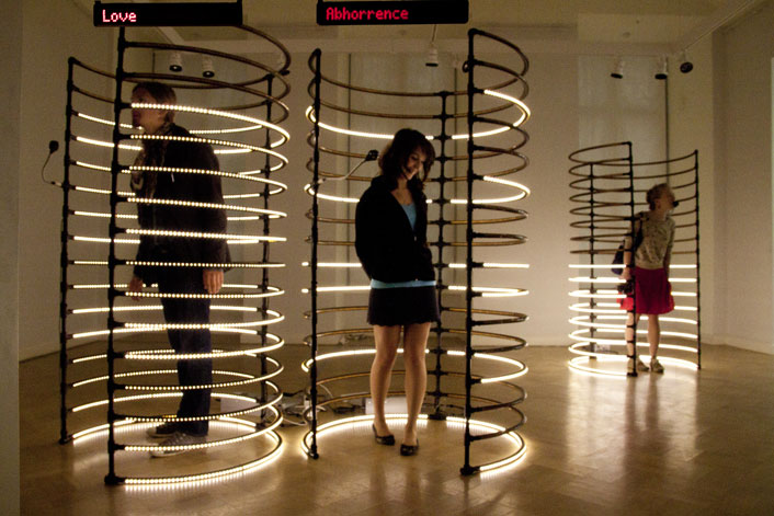 A computer searches for all words related to the concept of fear and desire in the RSS and web feed. Each word found is printed on a LED display. The individual ribs surrounding the viewer in the two parts of the installation react to the data, lighting up in a movement from bottom to top as results render matches with the alternating words. The more hits, the more light is cast beyond the fleeting headlines and tendentious news trends while entranced viewers try to catch their breath within technological bodies.