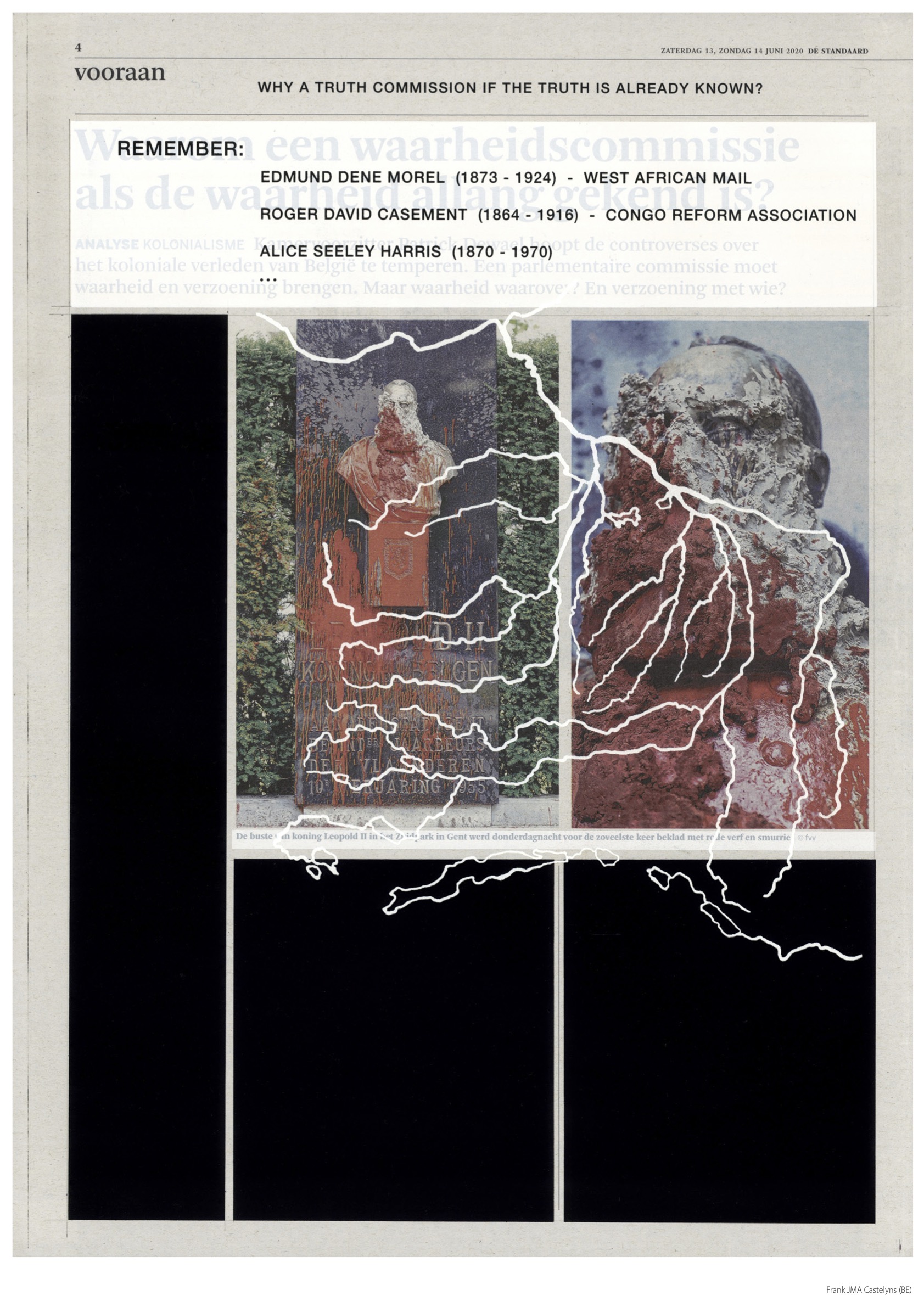 The white lines over the image of the smeared statue of Leopold II are the rivers of Congo that I applied to the original newspaper with phosphorescent paint along with black and white areas. These lines light up in the dark.