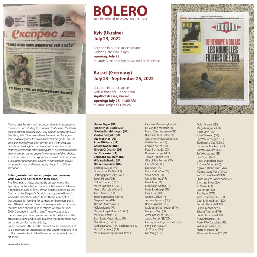 Five Ukrainian artists, selected by curator Alexandra Tyranova, contributed works in which the war in Ukraine is tangible. In Kassel, five German artists, selected by the German artist Jürgen O. Olbrich, participate in Bolero’s ‘nomadic exhibition’, which fits with the concept of Documenta 15, looking for connection between artists and different cultures. Bolero is a unique artists’ initiative that has been shown in 15 locations worldwide since 2010. Currently it has 93 artists. The newspaper as a medium-support of art works connects the location, the artists in Ukraine and Kassel in a time that more than ever demands comfort and solidarity.