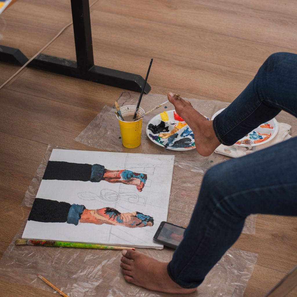 Apart from painting with your feet, you also make use of new media such as AI to generate images that you then transfer to canvas which we also show in the exhibition. How did you start using AI as a way to generate visual work?