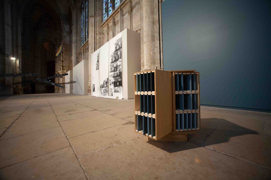 Edith Doove was invited to make a selection and present this in the majestic abbatial church of Saint-Ouen. She developed a specific scenography with a large 25 meter long plinth at the heart of the exhibition to showcase maquettes by the architecture graduates. Around this symbolic ‘table’ works of about 50 graduates are shown on and around the exhibition walls. For the repainting of these walls in a stone colour that moves away from the classic white box Doove succeeded in obtaining a sponsorship by Sikkens France.