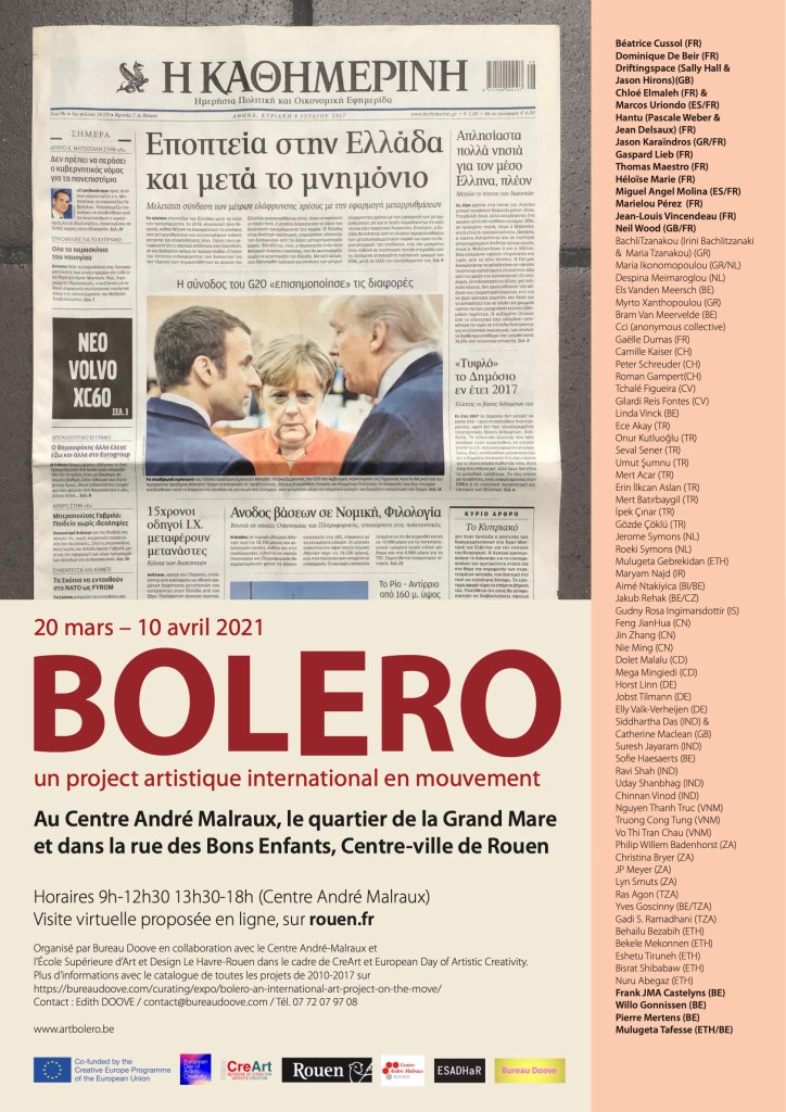 Since 2010 Bolero has travelled all over de world. Starting in Addid Ababa, Ethiopia, the homeland of Mulugeta Tafesse, it visited amongst others Vietnam, India, China, Turkey, Belgium and Greece where it was shown in the margins of Documenta 14. The project visited for the first time France during the CreArt Festival in Rouen in March 2021 in a collaboration with the Centre André-Malraux and ESADHaR Le Havre-Rouen.