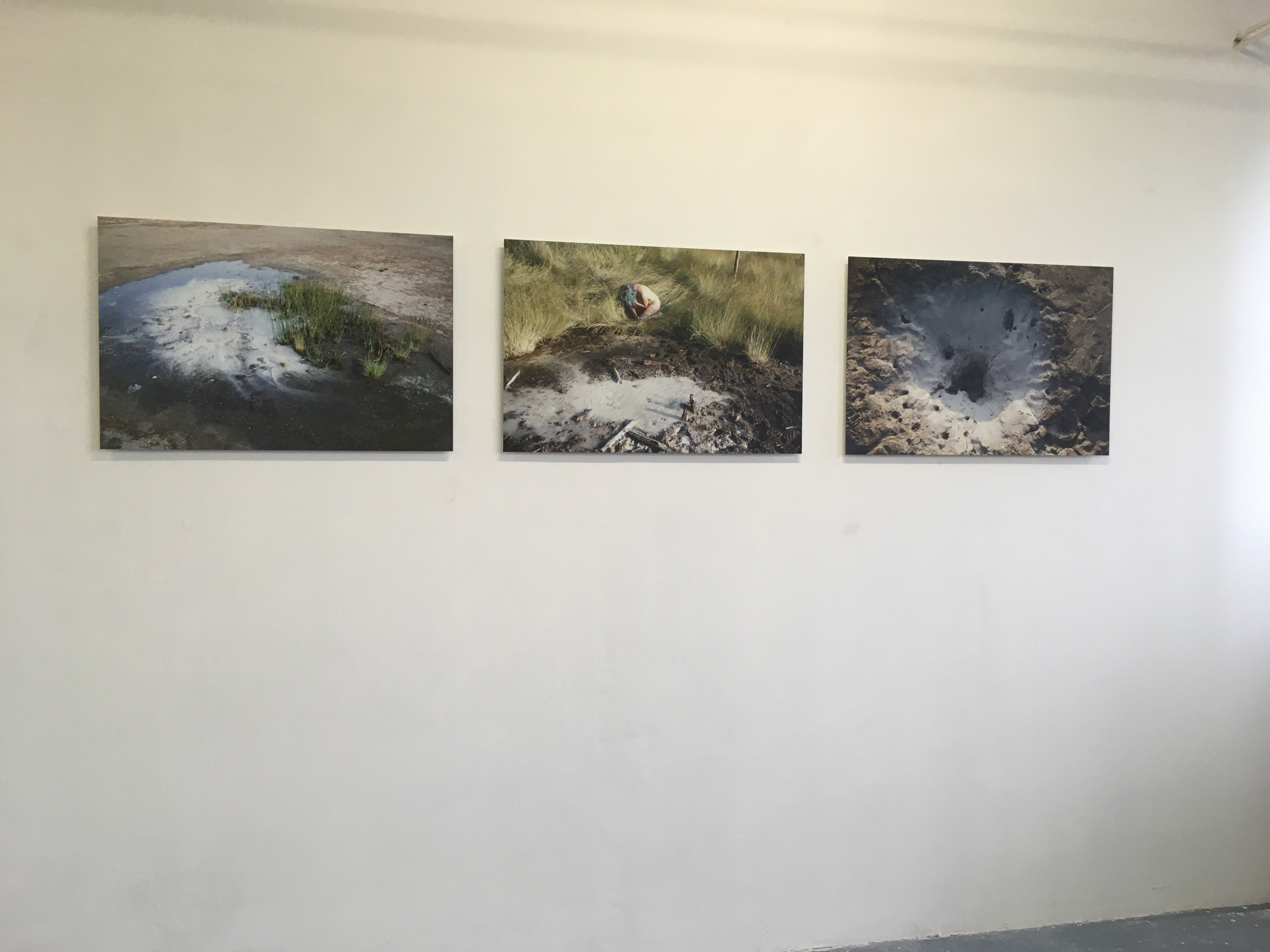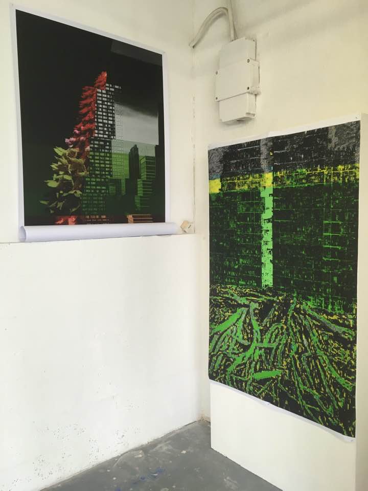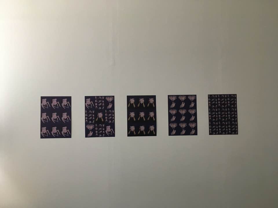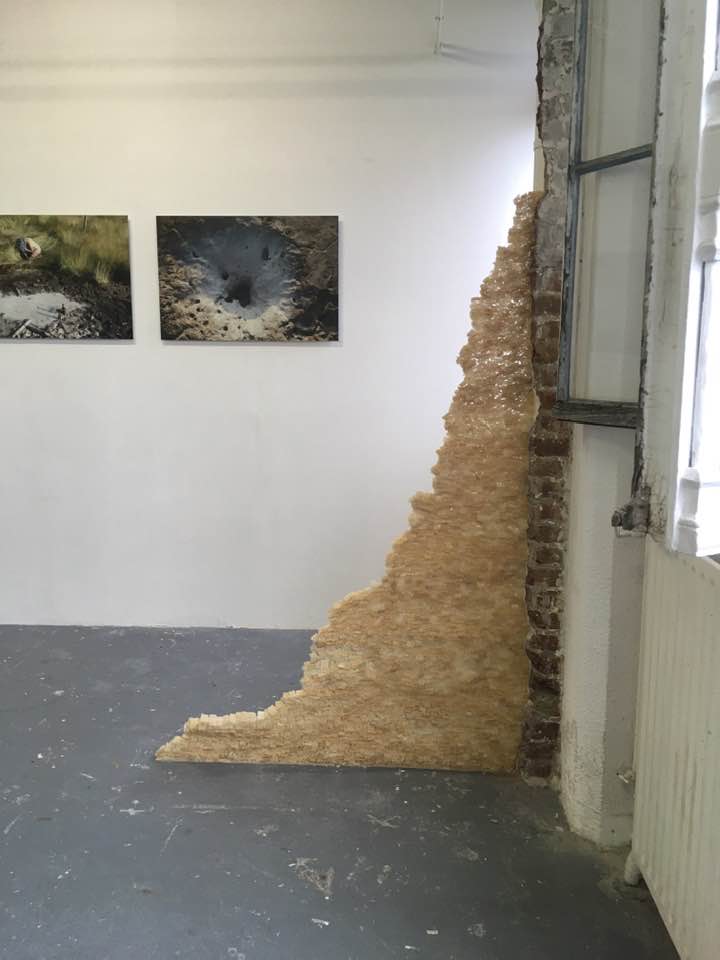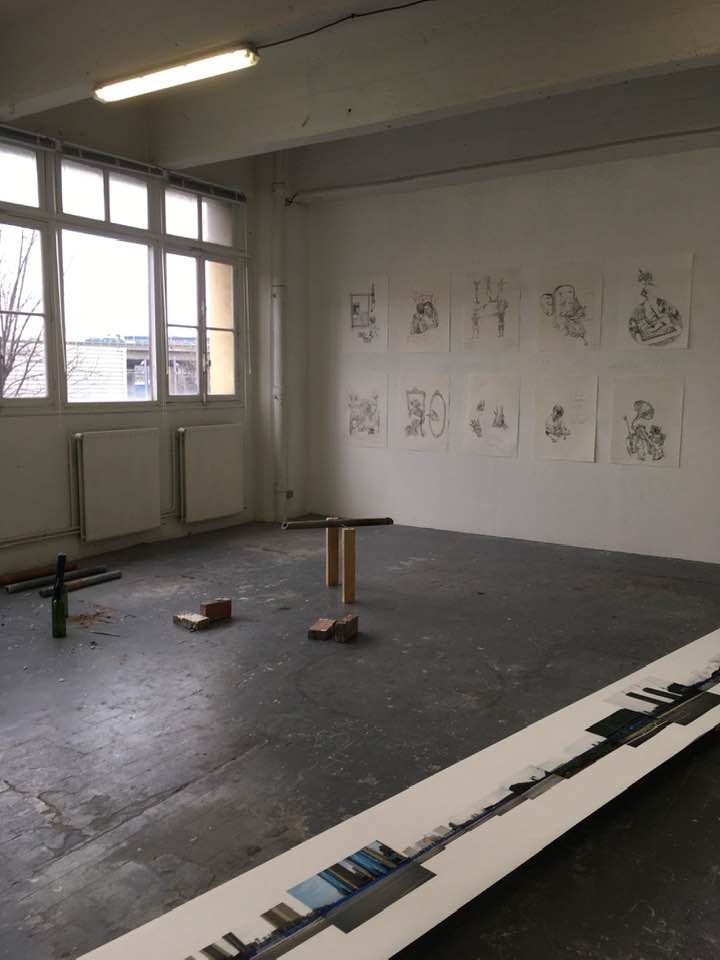 This page is a collection of images taken by several of the participants before, during and after the exhibition. In a certain sense it can be called a research exhibition in which we experimented with a collective form of curating in response to a space that is normally used as a collective studio, introducing a tongue-in-cheek form of mediating with a daily cake which showed the plan of the exhibition on which the artists were indicated through small parasols.